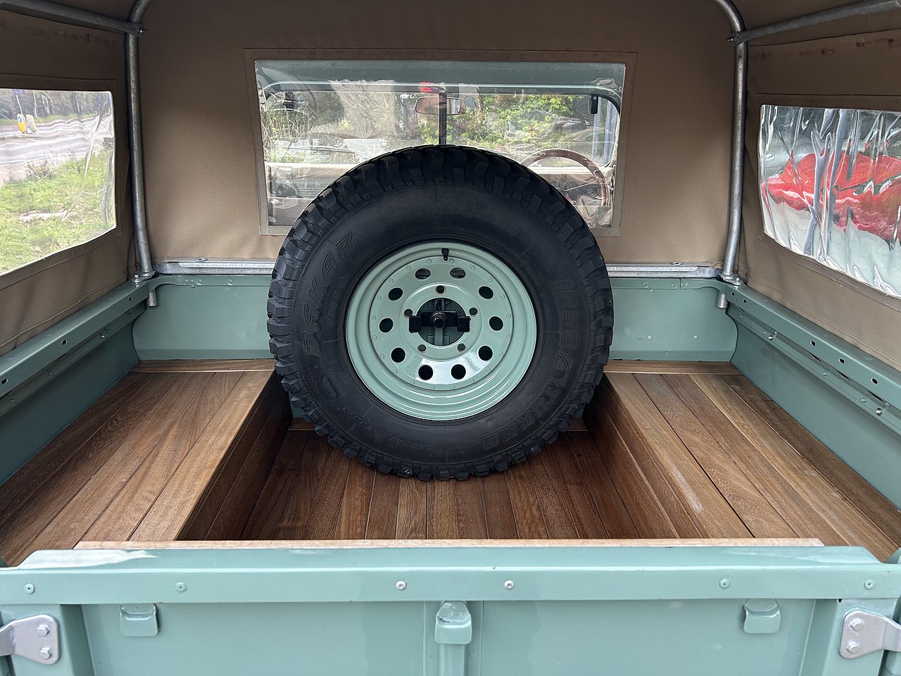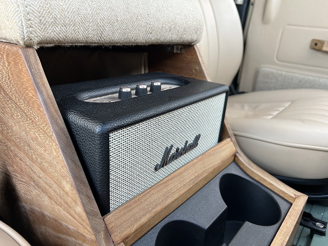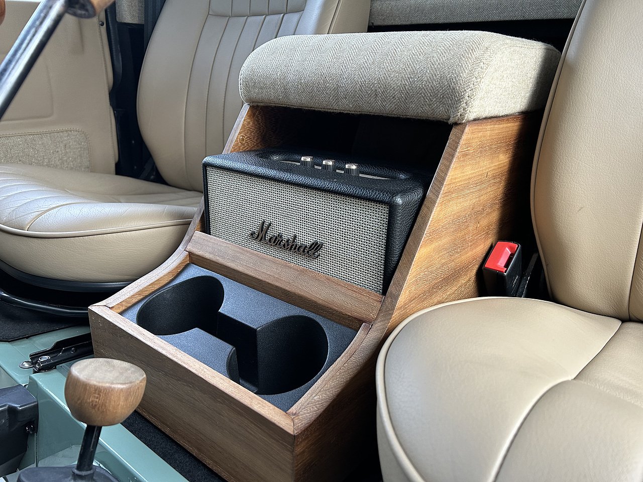Equipment includes a wood-rimmed Nardi Steering wheel, a leather-trimmed dashboard, instrument binnacle and steering column cowling, a body-coloured dashboard cubby and transmission tunnel, heating and ventilation controls, cabin soundproofing, a load bay-mounted spare wheel, a removable rear canvass roof with supporting frame and side and rear PVC windows, a side exit exhaust, K&N air filters, and full-length rear mud-flaps. Varnished iroko hardwood panels adorn the pickup load bay and inner tailgate, and the interior footwells. The theme continues with the interior door handles, gear knobs, and central cubby, which incorporates a trimmed armrest, cup holders, and a Marshall Acton II Bluetooth speaker.